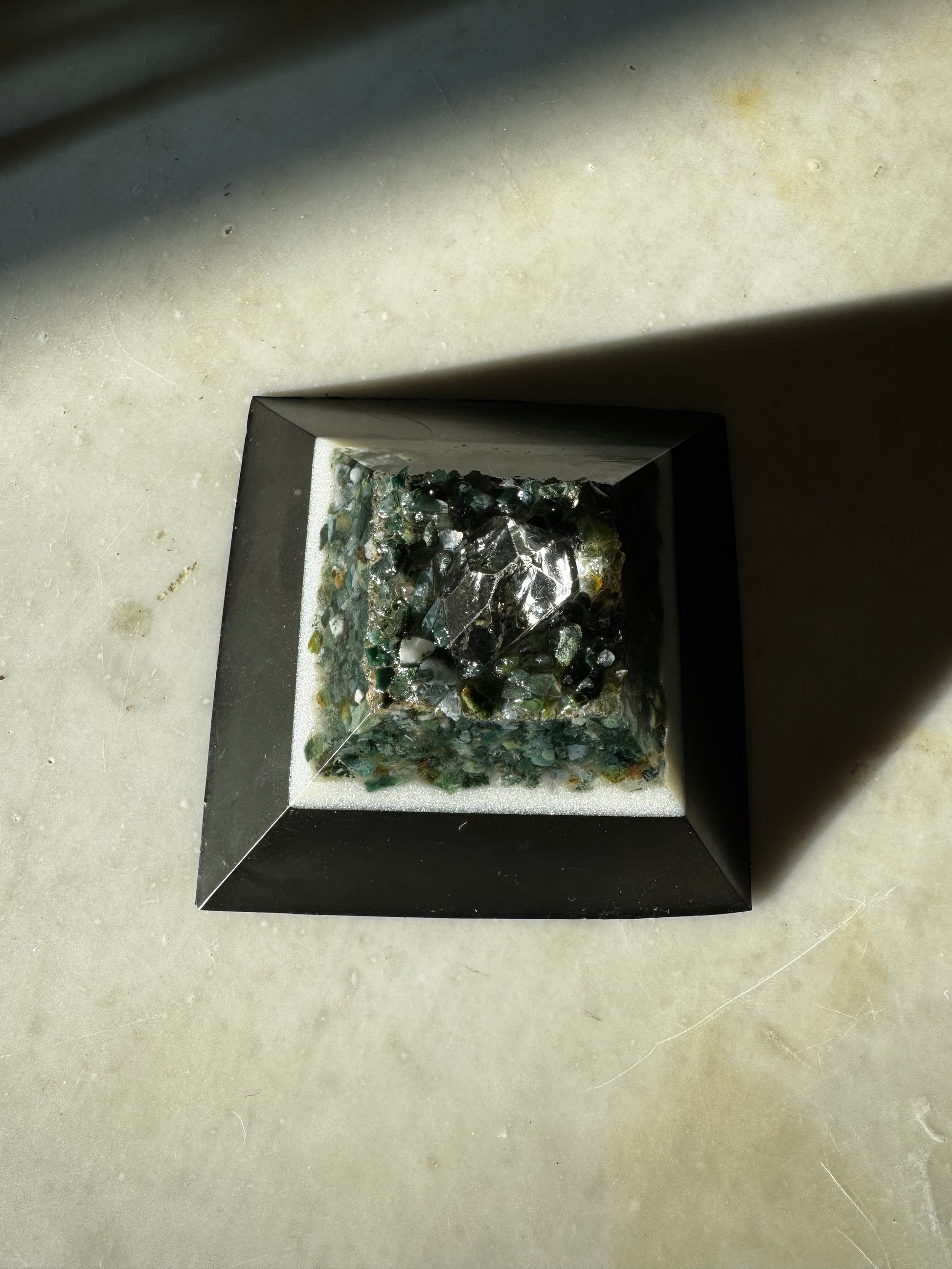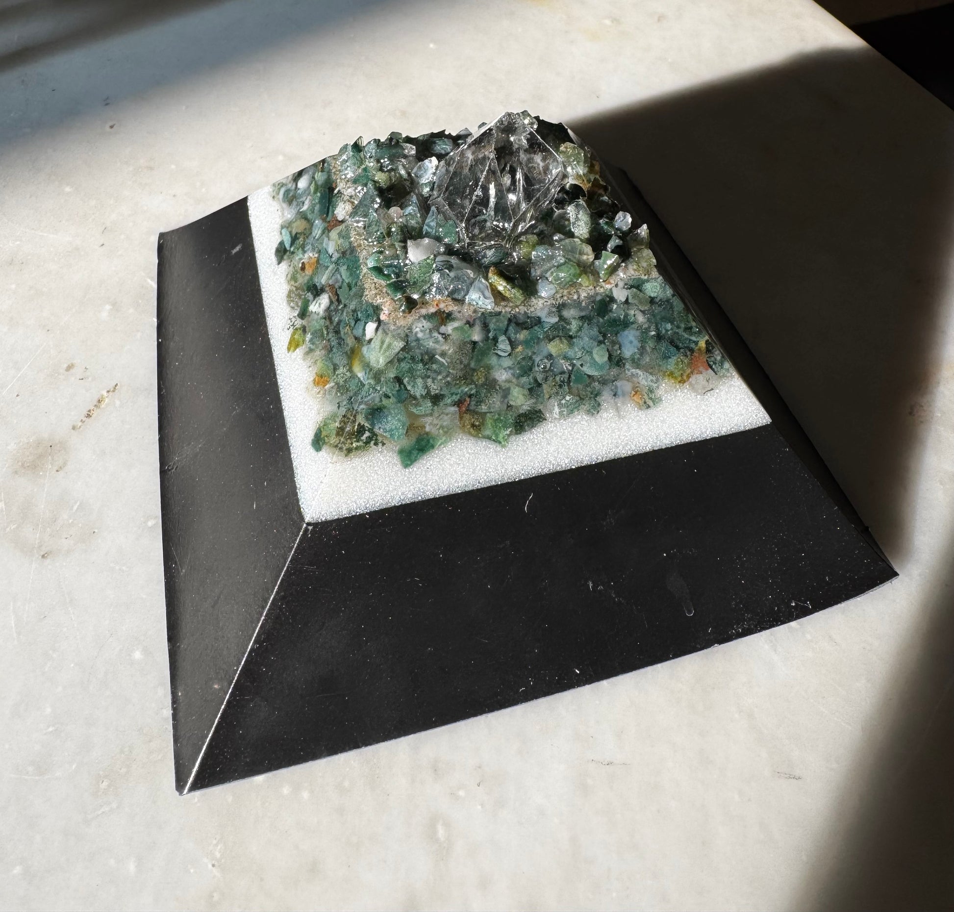 This beautifully hand crafted one of a kind open top pyramid is adorned with green moss agate crystal surrounding the clear quartz. It would be a grand addition to any room.