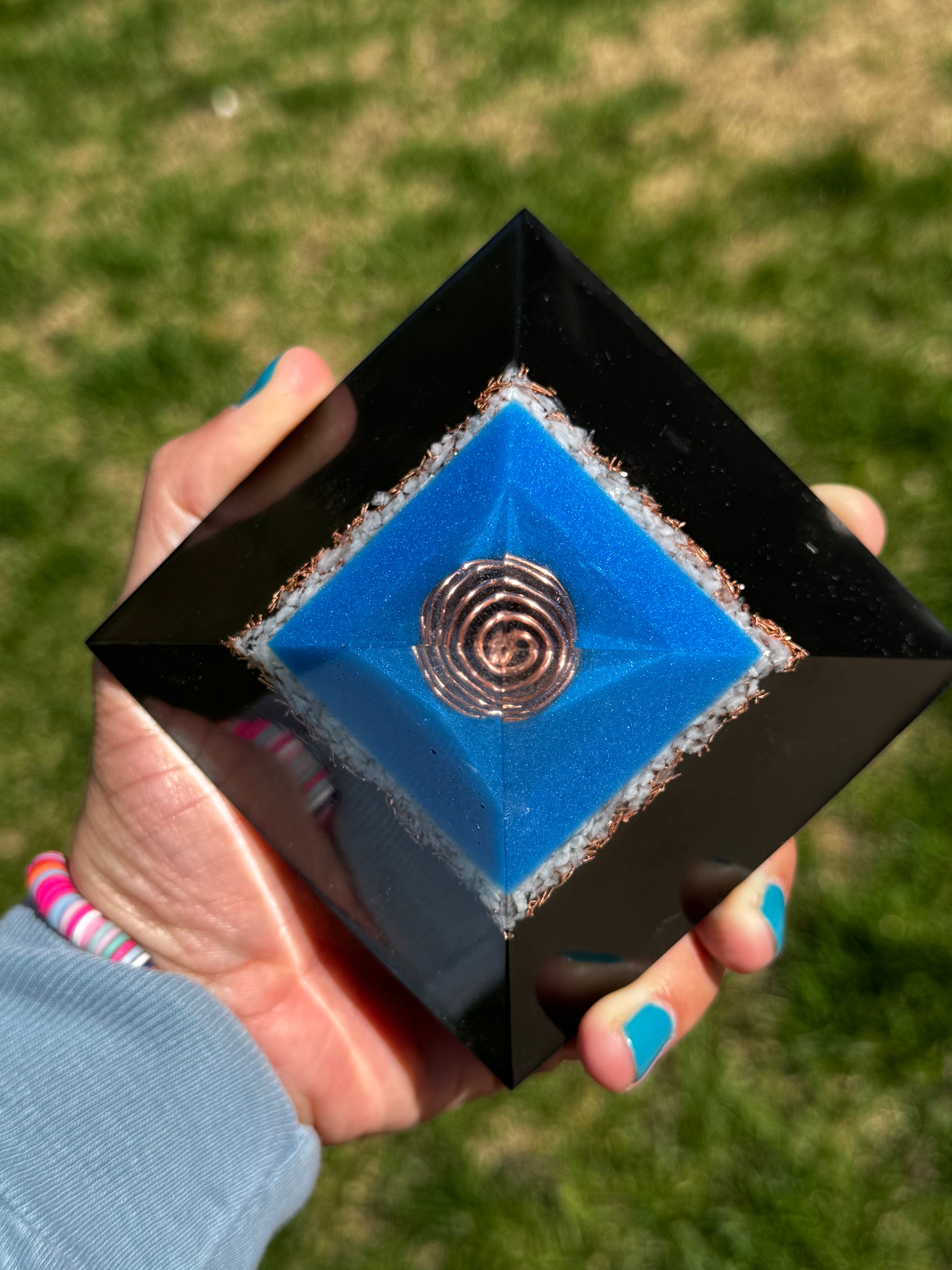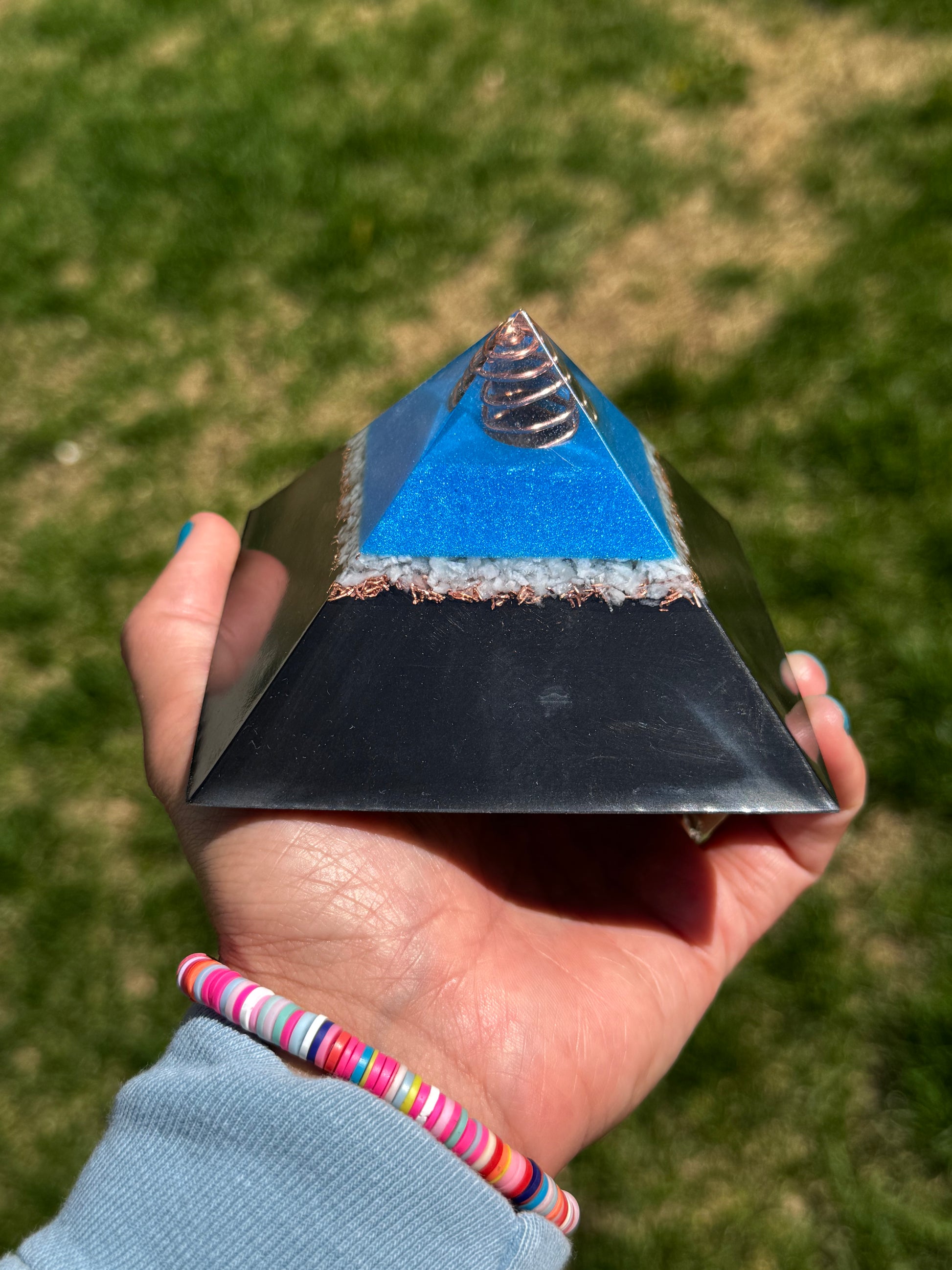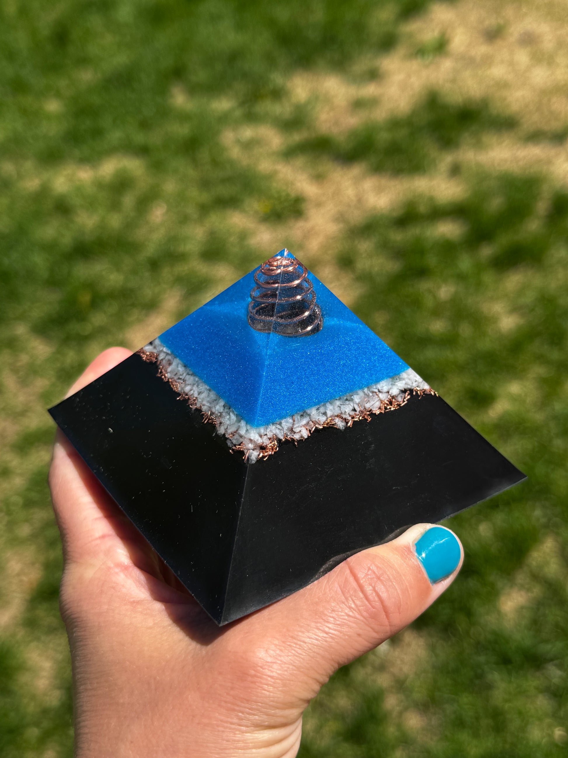 Minimize EMF’s in your space with this delightful mini pyramid, with a bright blue up against the contrasting copper shavings and crushed amazonite this is guaranteed to give any space an artistic flare along with helping to protect your space from EMF’s