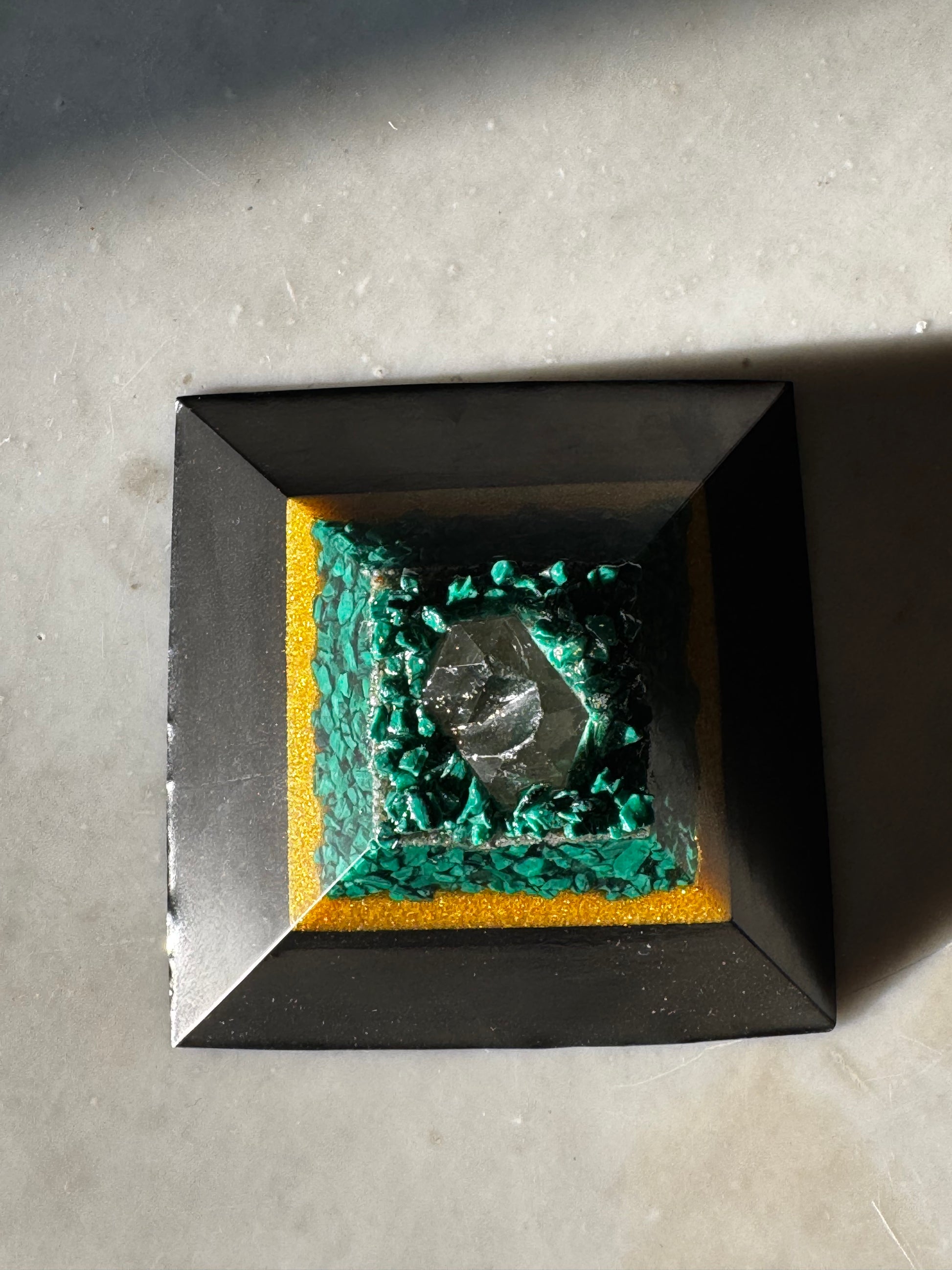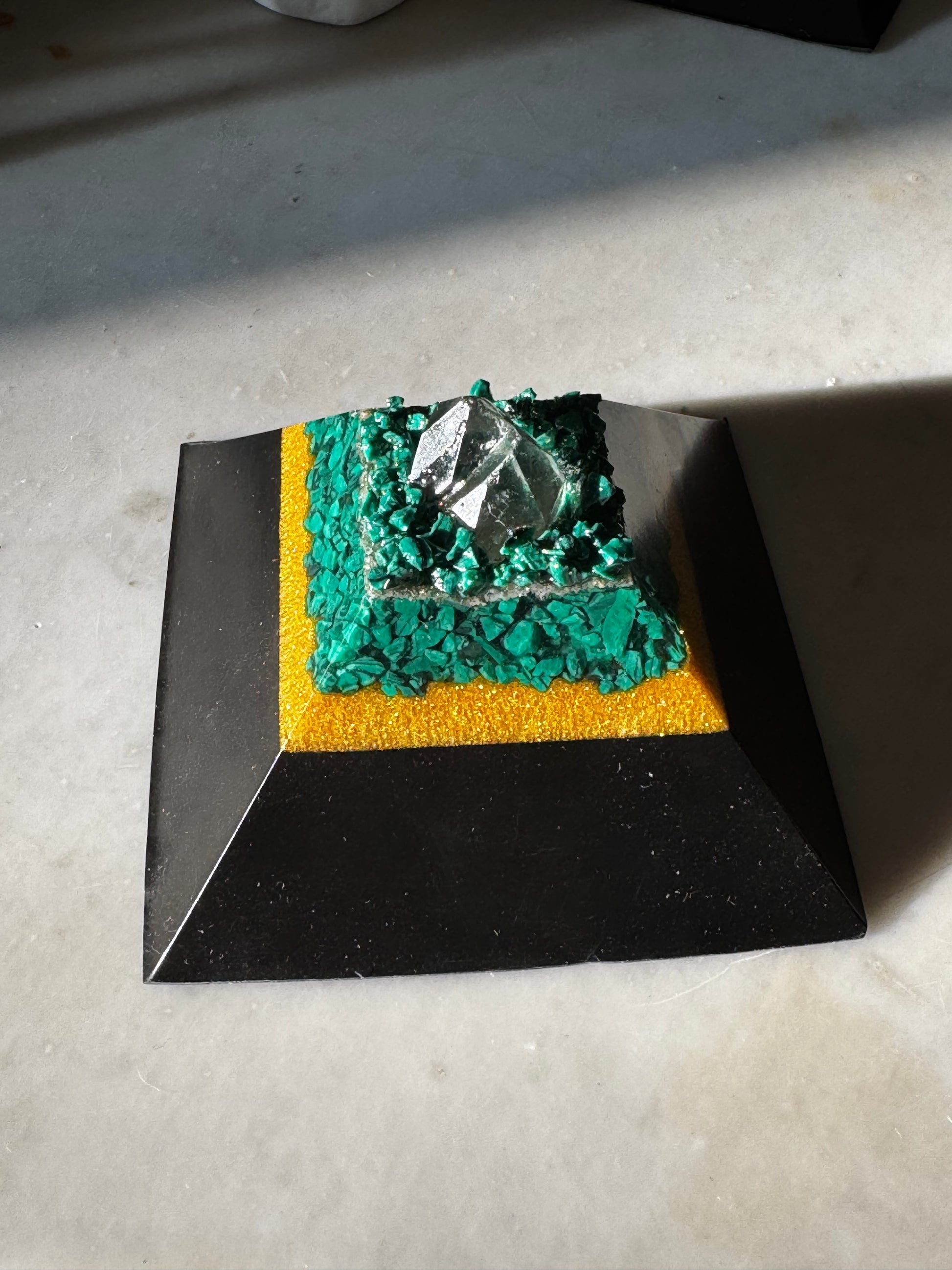 This one-of-a-kind open top orgonite pyramid is thoughtfully handmade and designed to bring peace, balance, and intentional beauty into your space. The Malachite green elements, with the gold layer that reflects light and warmth making this a meaningful piece. Let this piece add artistic flare to any room